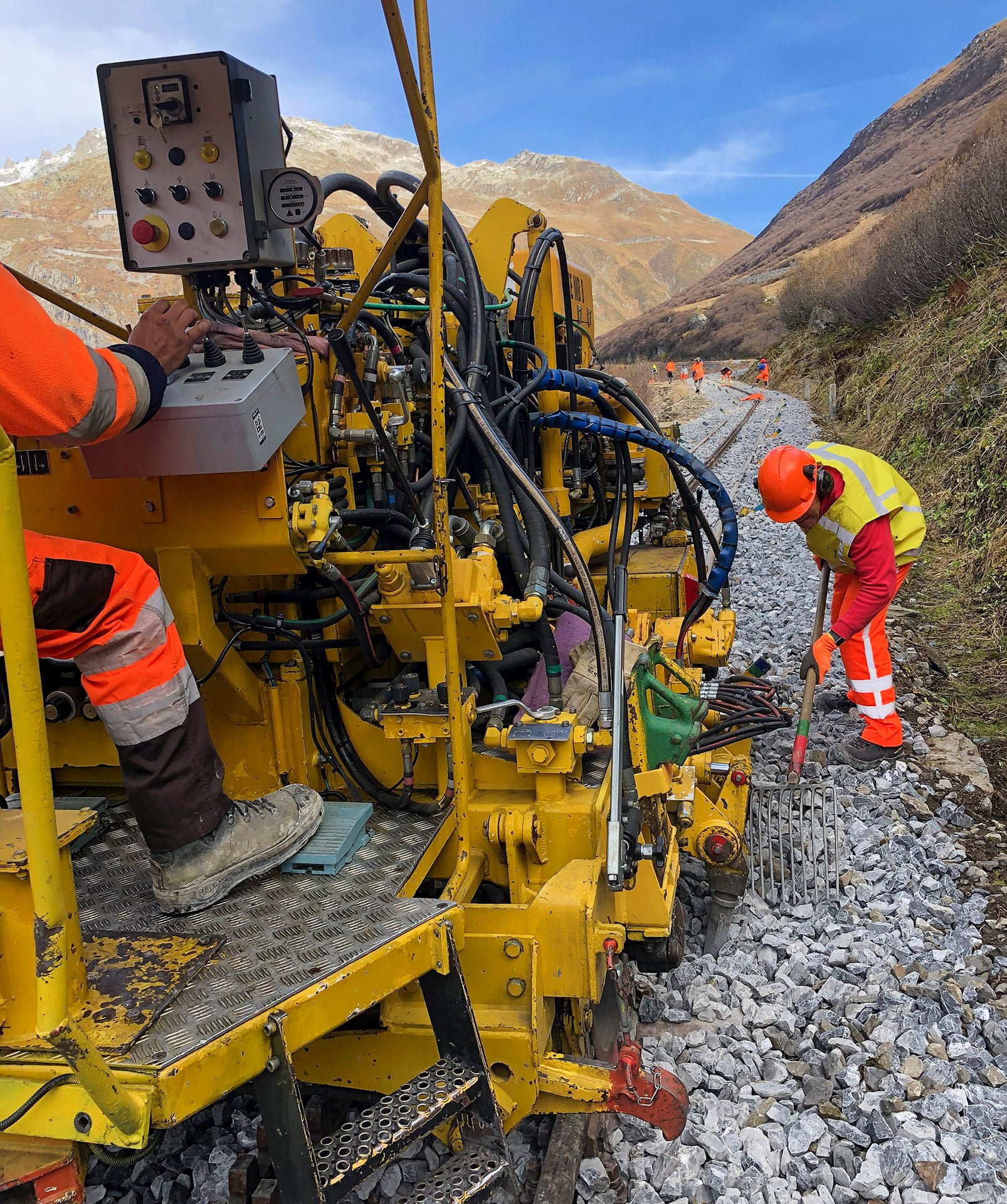 Dag 4 van ons avontuur stond in het teken van het opschudden en stoppen van het balastbed van het vernieuwde spoor. Met de stop machine en al vertrokken we met de werktrein in Gletsch. Het was nogal rustig in de trein. De meer ervaren heren hadden duidelijk minder praatjes dan de vorige dagen. Dit gaf ons een voorgevoel over wat ons te wachten stond. We hadden gisterenavond al gehoord dat we lange armen zouden gaan krijgen van het gesjouw vandaag. Ook waren we gewaarschuwd voor kromme ruggen.