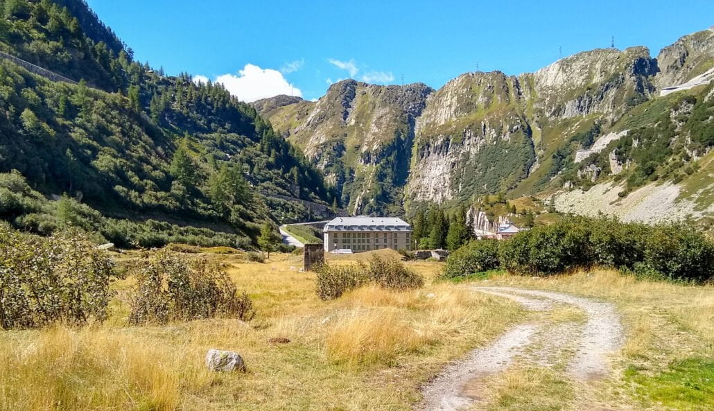 De wandelaar bereikt Gletsch met centraal het Blaue Haus