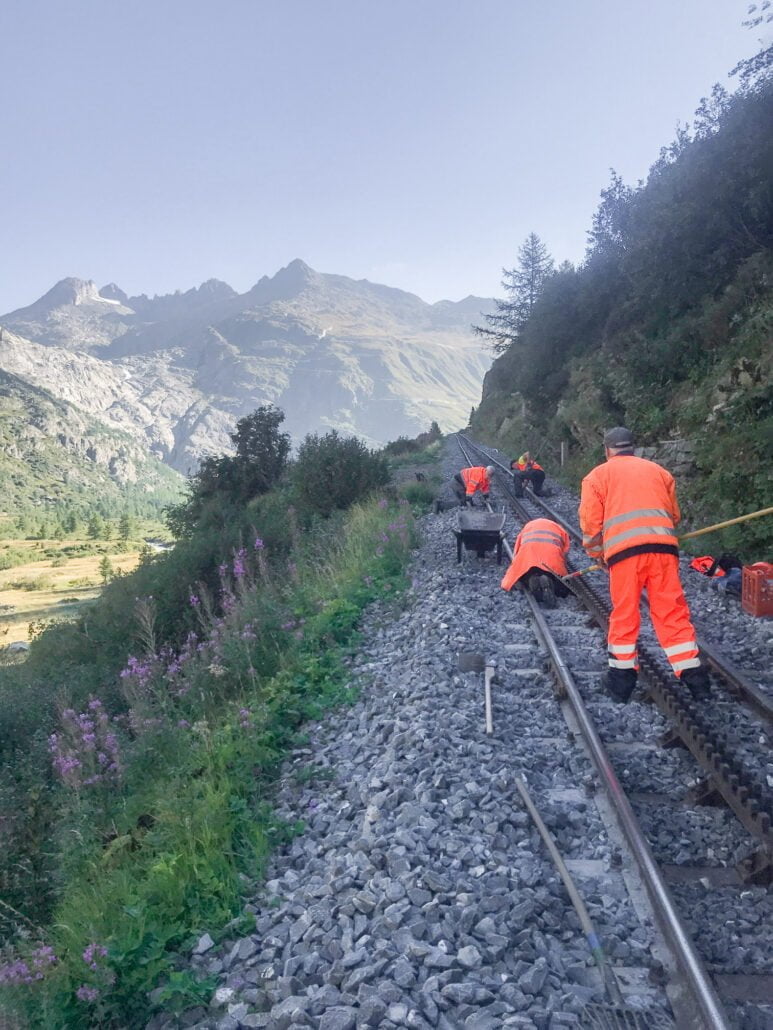 Vanaf Gletsch over een lengte van 250 m het ballast egaliseren op een deel van het spoor wat vorig jaar volledig is vervangen: de eerste 150 m zijn inmiddels gedaan.