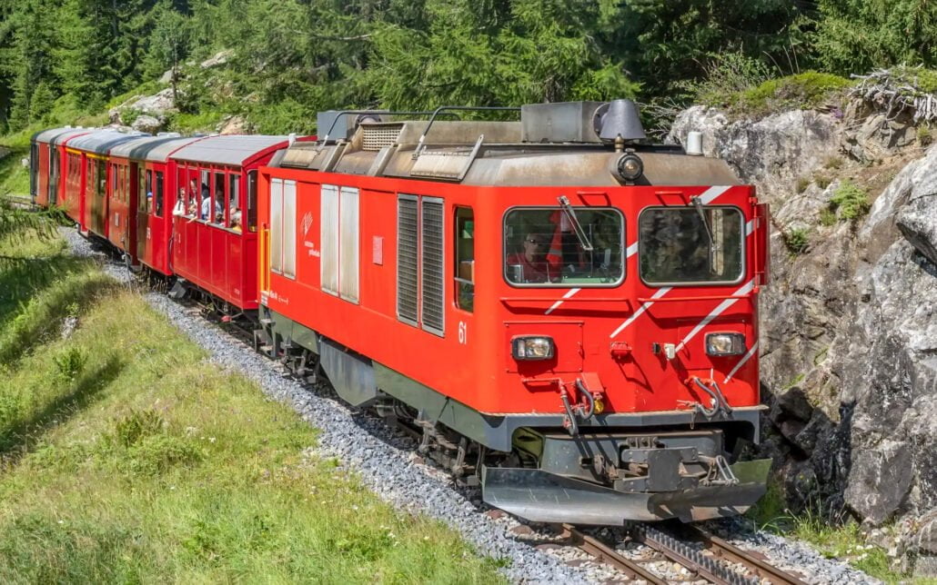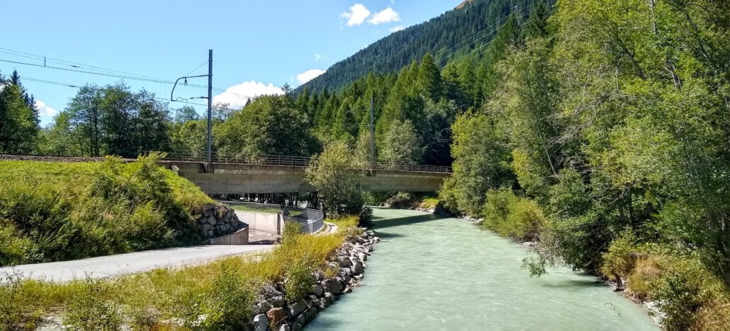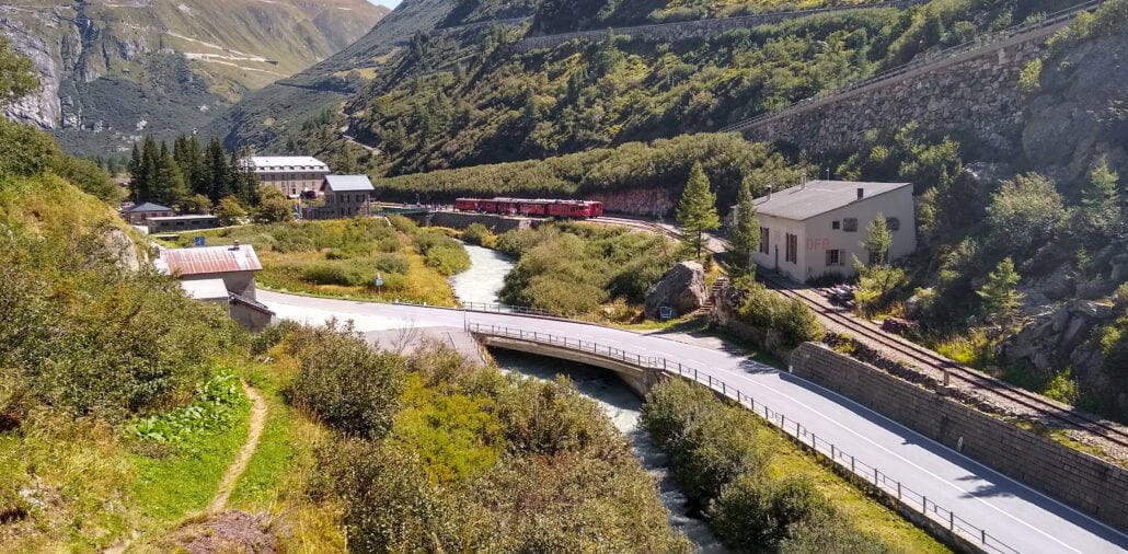 Terwijl de Rhone zijn nog lange weg vervolgt is de wandelaar weer onderweg naar Realp met een door een diesel getrokken trein want het was nog steeds kurkdroog