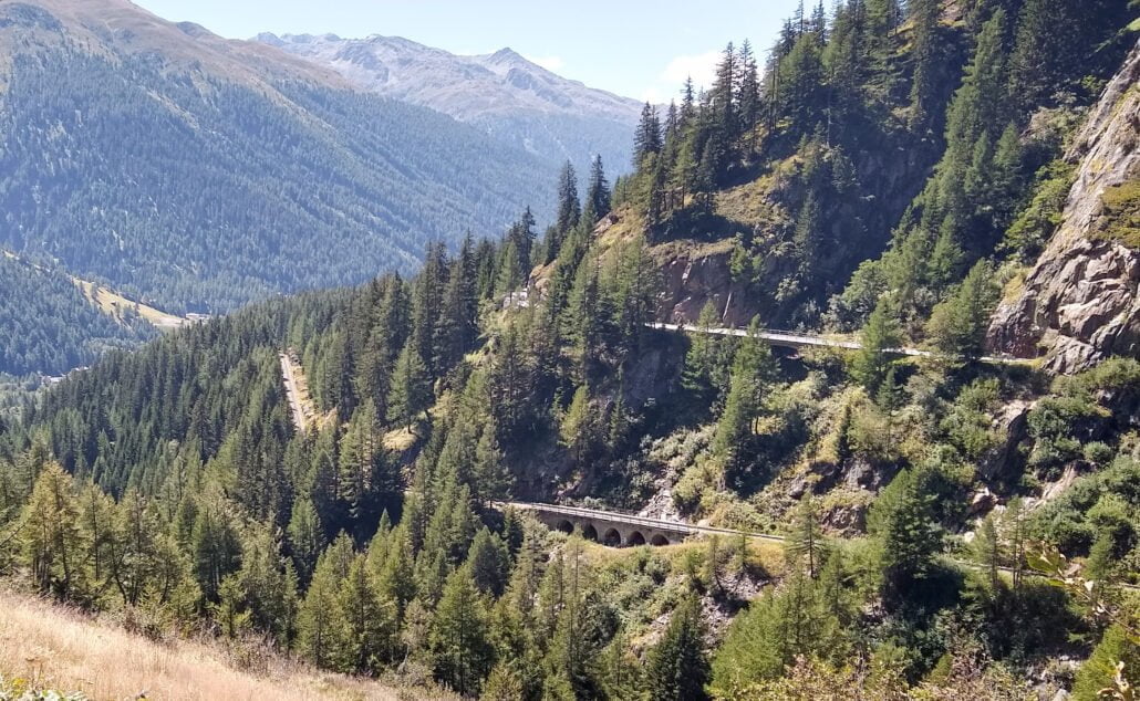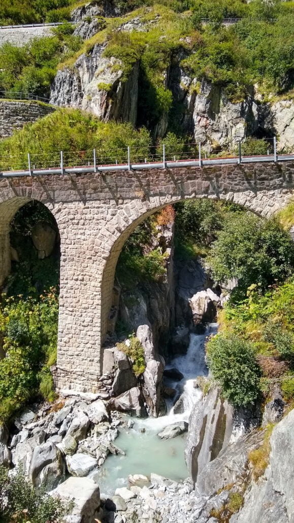 De wandelaar is ondertussen de weg overgestoken en begonnen aan de afdaling naar Det viaduct dat aansluitend wordt oversteken nadat de trein de onderste keerlus heeft afgerond. Het water stroomt hier met grote kracht onder het viaduct door
