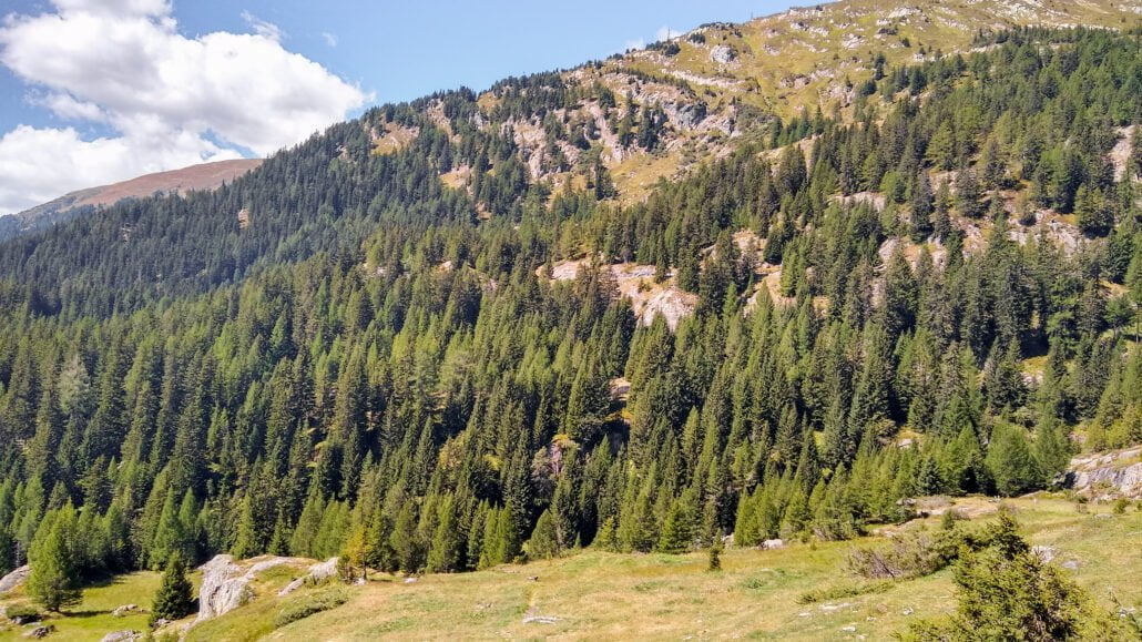 Het bos waar het spoor zich een weg door baant. De oost en west-zijde van het dal wordt hier gescheiden door de wild stromende rivier
