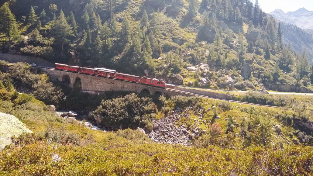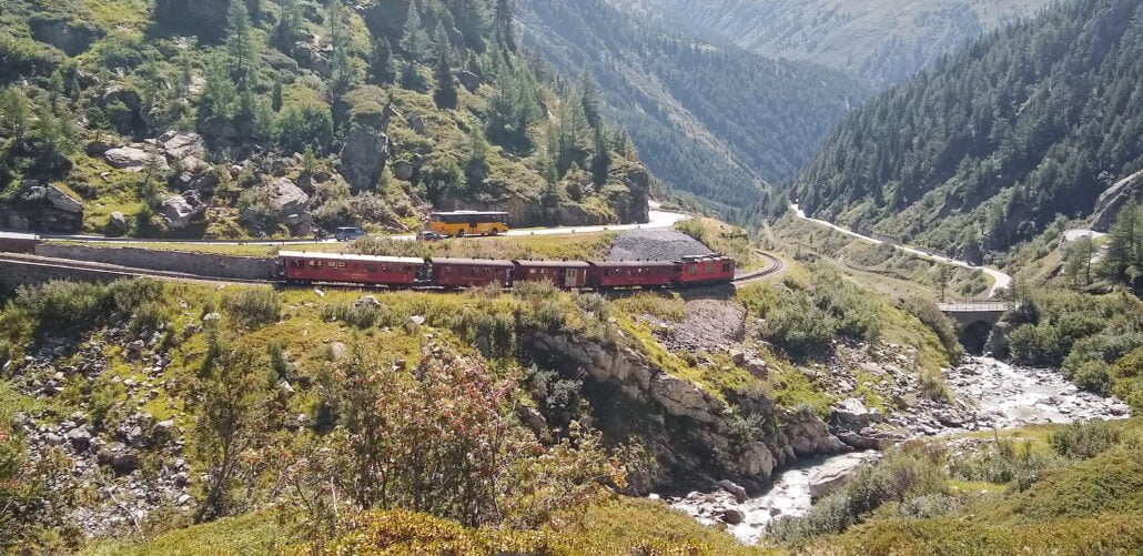 Gletsch is ondertussen gepasseerd en de vertrekkende trein naar Oberwald is te zien.