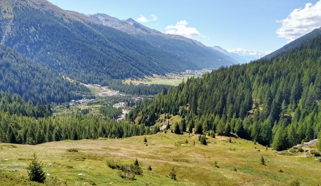 Een doorkijk naar Oberwald. Merk op dat er in het centrum van de foto twee fietspaden in een rechte lijn evenwijdig aan elkaar liggen. Een beetje vreemd fenomeen (ook vanaf het grasveld niveau). Het zou zomaar zo kunnen zijn dat het Zwitserse leger dit veld gebruikt heeft als landingsbaan voor als dat nodig mocht zijn. Daarvoor is de ligging ideaal (als aanvlieg route)